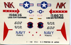 Instructions are on a card that shows two exploded views of where bits are to be attached. No color information is supplied and everything is in Japanese. Markings are for a single aircraft from RVAH-5 aboard the USS Enterprise at the time. Fortunately, Starfighter Decals has or had a set or two of aftermarket sheets for this aircraft.