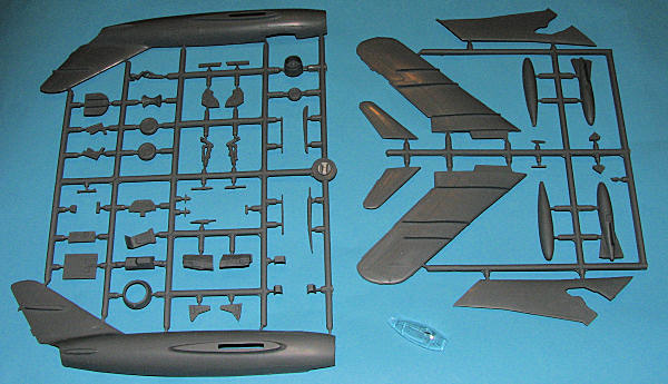 AZmodel's kit is presented on two grey sprues and a single, one-piece injected canopy. No resin or photo etch with this one. The molding is actually quite good without all the 'rivet detail' that seems so prevalent in the larger scales. The cockpit consists of a six part bang seat, control stick, side consoles and instrument panel, that, with the addition of the floor and for and aft bulkheads, makes into a tidy cockpit tub. Rudder pedals are molded onto the forward bulkhead.