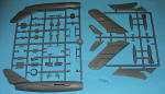 separate guns for the nose. Landing gear and their respective wells are nicely molded, though, like many of the parts, have some rather heavy mold seams that border on flash. Attachment points for the tail planes, drop tanks and cannon are all butt joins with attachment points engraved on the nose for the guns, but not on the wings for the drop tanks. The ventral strake on the rear is a separate piece and the tail cone is blocked off with compressor blade detail. The instructions would have you cut open the canopy, but this rather thick piece will probably break on you when trying to get the curved lower section cut. Much better to scrounge an aftermarket vacuformed one for the KP kit if you want to display the canopy open.