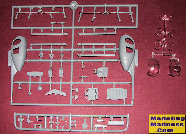 Unlike the Italeri kit, this one is not armed so you have no mini-gun and no ammo storage bin for the back seat. This one also does not have separate doors, though I think that for most of us, this isn't that much of an issue. One thing I did notice is that the frame lines in the nose of the standard round nose version are not as well defined as on the other. As with the Italeri kit, finding room for nose weight will be an issue. The kit also comes with both the 'short' and 'tall' landing skids. In fact, it is on these pieces that I found the only sink areas on the entire kit.