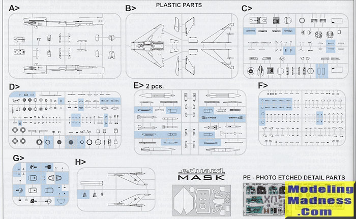 Instructions are well done on slick paper that includes a full color painting and markings guide with Gunze paint references. This might be an issue where Gunze paints are not available, but since the colors are relatively common, finding local substitutes should be easy. Markings are for six different aircraft. All of these are in various camouflage schemes. First is the box art plane from Egypt, followed by a Czech and Slovakian plane. The other three are from Poland, Soviet Union (with a nice shark mouth), and East Germany. The decal sheet is very nicely done and though not shown, there is an even large sheet for stencils and weapons markings. You will have to paint the orange bits on the Egyptian planes, but Eduard has provided the broad black outlines.