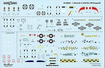 s what will be needed to adapt all the parts to the Monogram kit in terms of what needs to be trimmed away and what bits go with which markings option. The three options are the box art plane from the 8th SOS in Vietnam in 1971, a 103 TASS Pennsylvania ANG plane from 1987, and a Dominican Republic aircraft with a fearsome sharkmouth. A highlight of the decals for the first option are the bomb markings. These were on the pilot's final mission so many of the bombs were painted white with graffiti and other markings on them.