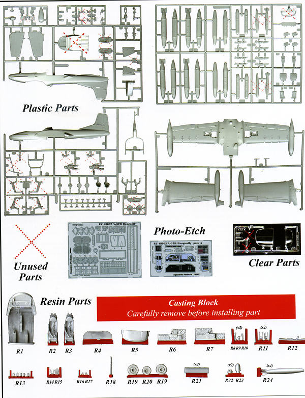 This is the second of Encore's 1/48 kits and they have wisely chosen a very nice one, the A/OA-37 Dragonfly. Again, this is a Monogram kit so they have provided a sound basis. The Monogram kit is from the raised panel line era and the molds have held up rather well. Molded in Poland this time, it is a light grey plastic with very little in the way of flash, though there are a few small areas.