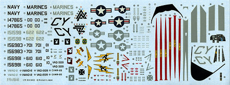 Instructions are excellent with 9 well drawn construction steps. Color information is given throughout the build process with Gunze and generic color references. Markings are provided for four aircraft. In light gull grey over white we have the black tailed box art plane from VMAQ-2 along with a line jet from VAQ-209 and the CAG bird from VAQ-309. An overall grey VMAQ-2 plane rounds out the options. Decals are well printed and offer both wing walk areas and the black areas around the canopy. The insignia look a bit 'thick', but you can replace them if you wish. I've had fairly good results with Fujimi decals and these should be OK.