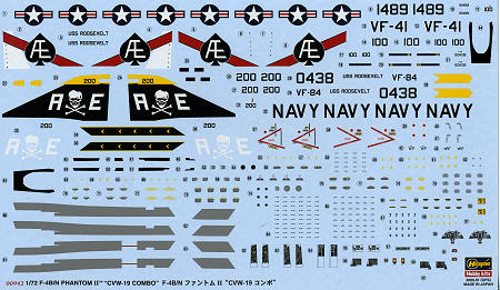 When one opens the box, the only thing one sees that is new (aside from two complete kits), is an addendum instruction sheet and a large decal sheet. The kit is your standard Navy F-4 kit that has been around for 20 years. It has held up quite well as I found little in the way of flash, quite a feat as parts of this kit must have been cranked out hundreds of thousands of times over the years. The assembly instructions you get are for kit KX 3 which was one that had VF-111 and several other units for decals. You can pretty well follow these without fail except for the upper fuselage antennas. This boxing uses but the single upper UHF antenna. Another minor glitch is that the VF-41 aircraft is listed as an F-4B when it is really an F-4N if you believe the box art. Assuming that both of these squadrons deployed aboard the USS FDR at the same time, they would both have been the same variant of aircraft to ease maintenance. I recall a friend who flew with VF-21 being happy about getting new F-4Js, but when it came time to deploy, then got F-4Ns as a replacement as the other unit on the Ranger was flying the N models. As a point of interest, these two units were assigned to CVW-6 at the time, and not CVW-19 so Hasegawa goofed on that one.