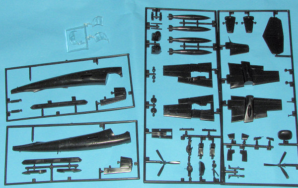 The kit has minimal cockpit detail, basically a seat and pilots. Nose gear and wheel are all one piece and there is no wheel well detail, nor is the well boxed in. The instructions show a need for a lot of weight, but don't specify how much. I found a touch of flash on my clear bits and there are ejector pin marks all over the place on the smaller bits. There are holes pre-drilled under the wings for six hard points, yet only four pylo