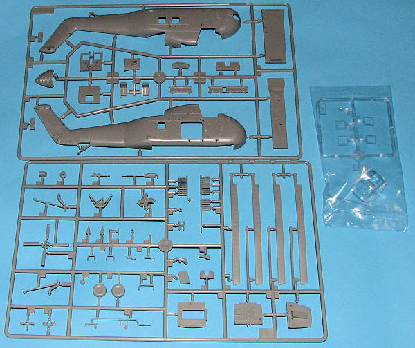 As widely used as the H-34 has been, prior to this kit there has been only conversions for the Matchbox or Frog Wessex until Italeri released the H-34 variant several years back. Not be outdone in its extremely rapid expansion of its product line, Hobby Boss now has added the Choctaw to its line-up. The kit's 59 pieces are on two very nicely molded grey sprues with one clear sprue. The clear parts have quite large frame lines for the main cockpit canopy so masking will not be an issue. The side windows are recessed to allow easy installation of the cabin windows.