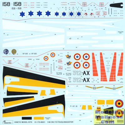 The instructions are well done though as I mentioned, do not differentiate which marking option (if any) use optional parts. It does offer mulitple paint options and there are five markings options. Two are French. One is of the aircraft in the photo which is in unpainted metal with daglo bits. You'll have to paint the nose markings. Interestingly, the plane on the box art is not the one provided on the decal sheet. The other is a Patrouille de France plane from when they were flying Magisters. Two other markings are Israeli, one in silver with international orange markings and the other in a camoulflage scheme. The final option is a Belgian plane that was with their flight display team. This one is overall red. The large decal sheet is very nicely printed and has large areas already provided which should help alleviate some of the masking that would otherwise be required for some of the more complex schemes. These are printed by Cartograf so should be properly opaque.