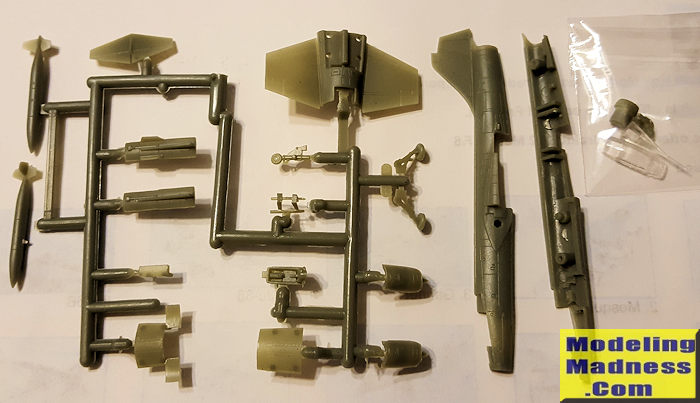 Typical of these types of kits, the engraved detailing is very much overdone, but is often overlooked. There is a pilot figure to fit into an interior which is overly simplified and really needs to have the pilot on board as tehre is no real seat or instrument panel. One of the fuselage halves includes the fin and it traps the cockpit between them. All of the attachment posts are quite large and some of the parts need to have large ejector towers removed before installation.