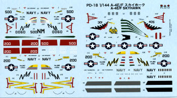 The instructions are in Japanese, but this isn't a problem as the construction illustrations are quite clear and easy to follow. There are markings for four aircraft, three of them in light gull grey over white and from the USS Oriskany in 1967/68. Unusual and a first is that one option is for a NAF Atsugi gate guard. I faintly recall seeing this plane on the edge of the parade ground there back in the early 1970s. Gate guards usually get repainted with great regularity. This one is overall white with markings for VA-192 and VA-195 on each side. The 'regular' markings provide two VA-192 planes with their colorful yellow fuselage/intake markings. The other is from VA-195 and all of them are CAG birds. The colorful sheet is superbly printed by Cartograf so you know they are of the highest quality.