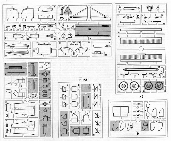 Molded in grey plastic, there are nine total sprues, all of them with very nice surface detailing. Two of them are duplicated (the one with the seats and the one with the wheels) and one is clear. I found some flash on parts as well as sink areas on the ones that are really thick. A few were also suffering from mold misalignment (notably the control sticks), and anything of any size had ejector pin marks or towers on one side. This means that a few parts (like the doors) will need some additional attention.