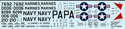 raft assigned to the 'parachute group' at NAF El Centro in overall white. Next is the box art plane is from Kaneohe Bay and in the standard International Orange and White colors. The last is in the very early yellow scheme while assiced to the Pacific Fleet All Weather Training Squadron in 1970. Decals are superbly printed and very glossy. Roden decals do not have a good reputation for stick so many will be hoping for an aftermarket sheet or two for this plane.