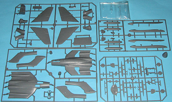 Though the wings are not designed to be folded, the outer sections are separate and there are bulkhead blanks that go in the open ends to help get the parts together. This would also make it easier for those doing aftermarket wingfold parts to design them. The kit has full intake trunking to a compressor face section and has separate and full wheel wells. The separate nose cone leaves room for weights. Hannants has told me that all the nose cones have a dimple in them, something easy enough to fill. There are six under wing pylons but no weapons, only a pair of fuel tanks for the outer pylons. A separate windscreen and canopy, both crystal clear, are included and the kit offers the large boom mounted fuel tanks as separate assemblies, allowing the FAW.1 variant to be done if one so desires (though none of the decal options are for this version).