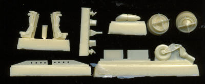 These seats and some other smaller parts are made of resin. That includes the engine exhaust compressors, nose wheel/gear assembly, fences under the fuselage, nose gear doors, radar hood, refueling probe stub and a few other smaller bits. These parts are superbly formed and devoid of any glitches.