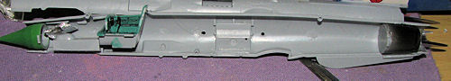 used for the nose radome. I also glued in place the nose gear well and added some weight above it to be sure there would be no tail sitting issues. I should point out that the attachment area for the radome is very small and test fitting showed it could not add it in after the fuselage was closed up so that will need to be masked before overall painting. I also painted the inside of the fuselage at the intake and exhaust area with aluminum.