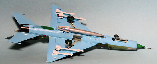 The fin and upper spine are separate, allowing all the near similar MiG-21 versions to be built. It also is nice that one does not have to fill the upper fuselage seam. As on other MiG-21 kits, all the scoops, shields and antennas ar separate items. Even the need to slightly bend the main gear door is the same on all the others. Weapons galore are provided that include a centerline fuel tank, two types of missiles and rocket pods. RATO units are also part of the package. There is also a somewhat lame looking centerline gun. No wing fuel tanks are provided, which is not really bad as they'd fit on the outer wing pylons, something that just