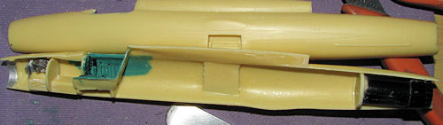 When removing the resin pour stub from the bulkhead of the cockpit, this bulkhead snapped away. It was repaired once the pour stub was removed. The cockpit was then painted blue-green using Testors enamels. I had to brush on two coats to get good coverage. Once that was done, I added the control stick and painted that as well. The exhaust area was assembled and painted Alclad II Jet Exhaust. There were quite a few holes in these pieces and a chunk missing from the attachment area of the exhaust, but since those will be hidden when done, no worries. I painted the inside of the intake and exhaust area with aluminum. The nose gear well has a bulkhead just behind the wheel hump to help align it in the fuselage. These assemblies were then glued into the right fuselage side. The exhaust back plate needed quite a bit of sanding down as it is too large. When those were in place (and I installed each one separately, taping the fuselage halves together to ensure proper alignment), a bit of weight was added above the nose gear well, just to be sure it would not tail sit.