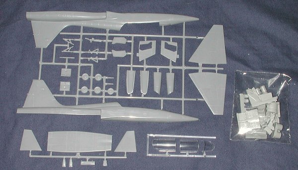 You get a goodly bag of resin bits. I didn't open it as I stopped opening resin bags for preview pictures after I lost a bunch of parts to a kit I wanted to build by doing that. However, here is a rundown of bits. Instrument panels, seats, control sticks, cockpit tubs (yep, two of them, each holding a single seat), nose gear well, speed brake well, exhaust, canopy actuating arms, speed brakes and various smaller struts. Naturally, the seat tracks for the front seat were broken off my forward canopy section. There are no optional parts.