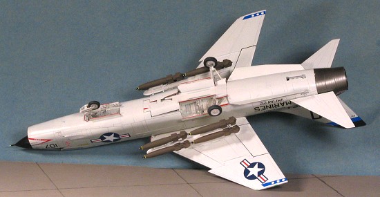 It was at this time that I'd realized that I'd not drilled the holes in the fuselage. Fortunately, the exhaust was still not installed, so taking a strong light, I shone it up the fuselage. This was enough to allow me to see where the holes were for the ventral fins and the afterburner cooling scoops. Those were duly drilled out. The missile rails were an impossibility thanks to all the subassemblies blocking the light so those were left off. I can understand the cooling scoop attachment holes being blocked, but not the ventral fin holes. Those early F-8s that didn't use the ventral fins had a different nose so it isn't like this fuselage can be used for an early F-8. Anyway, with those opened, the parts were glued in place and it was time to think about some paint.