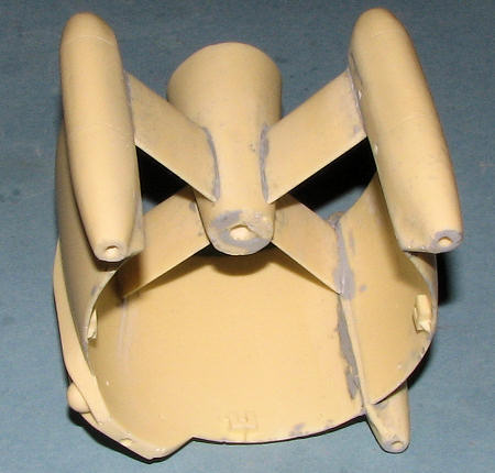 The instructions would have you build up the prop and the central housing with its braces first, then attach the motor pods and then attach the shroud parts. Naturally, I deviated from this by building up the central housing, then attaching the motor pods to the large front piece and then sticking in the central housing. It seemed to me to be a 'six of one, half dozen of the other' sort of thing. When building the prop assembly, I had the blades angled opposite each other in the two sections. I figures that the last thing needed by this sort of aircraft was a lot of engine/prop torque and they'd have done contra-rotating props anyway. I left off the prop assembly until after the shrouds were glued in place to kep it from being broken. Then, once the shroud pieces were on and I had a chance to fill and sand the joins (something you have to do on all of them). I then test fit the prop assembly. The hole for the shaft is not deep enough nor large enough so it was more motor tool work. I then glued on the prop. This was major mistake #1.
