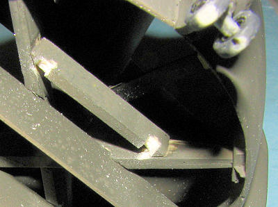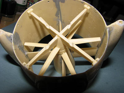 You see, though one is not told this, the prop hub has to be aligned just so in order to facilitate the major lower cross braces. I'd not taken that into consideration and had to snap of the prop to realign it for the braces. The large cross braces fit snugly into mounts molded on the inside of the shroud. I did not glue the prop assembly until both large braces were firmly in place. Having snapped off the prop shaft removing it, I aligned things as best I could.
