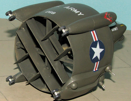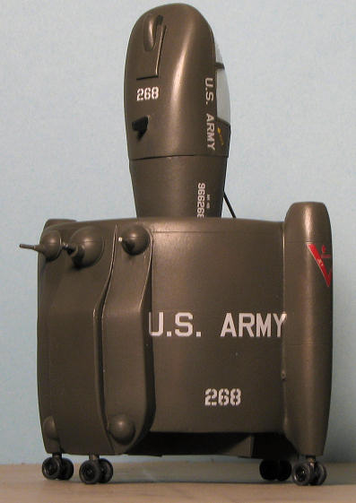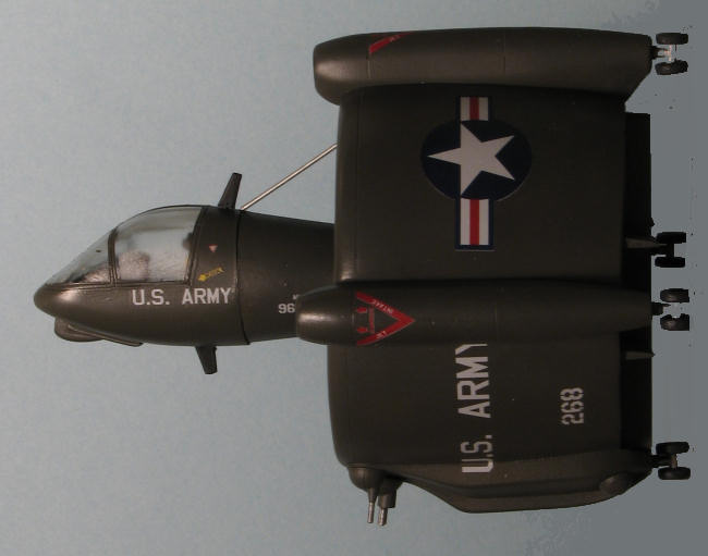 Then it was all given some gloss clear for the decals while I decided on the cockpit position. Having decided on an 'in flight' attitude for the cockpit, that was glued in place. I also attached a section of wire (apparently part of the safety cable for the moveable cockpit). The JBot decals are covered by a single carrier so the markings need to be cut out separately. My fears of a transparent white went away when I applied the first white marking. These are quite thin and also quite tough. I had some of the markings fold on me but was able to get them straightened out, something that would have been curtains for most thin decals. I had no trouble putting them on and they reacted well to Microsol. I did find the color ones to be slightly off register. On the shroud where the guns are located, the space on either side is a bit too small for the US Army and National insignia decals. The rest went on without a hitch.
