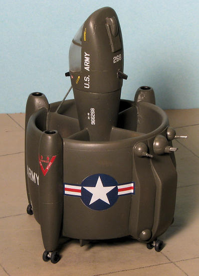 The cockpit section has two positions. One is where it is horizontal with the ground with the rest of the airframe vertical. This is how it would normally appear when not being flown or when being maintained or used in ground support mode. For flying and perhaps for static display at air shows, the cockpit was vertical to the airframe. For the horizontal mode, a piston is shown. A section of soft wire is included in the kit.