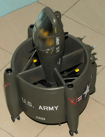 The most unique proposal in the AAFSS (Advanced Aerial Fire Support System) competition came from the San Diego division of Convair. The Model 49 did not fit the normal mold for either an airplane or a helicopter, and represented something entirely new. Propulsive power came from turbine engines driving counterrotating propellers within the shroud. Convair believed that the system was inherently more reliable than a conventional helicopter, and pointed out the only pilot control inputs involved directional control and setting rotor blade angle and engine speed. The crew of two occupied an articulating capsule on top of