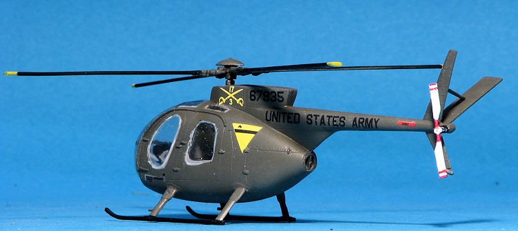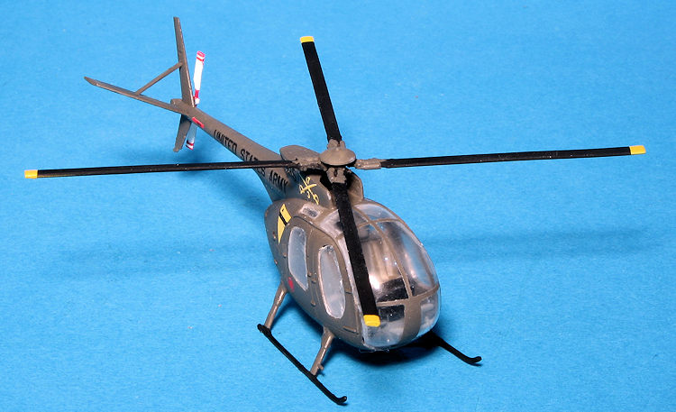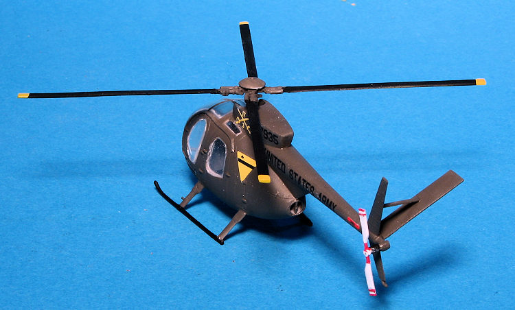 I hesitate to recommend this one. I found it generally more of a challenge than I really like, but I also acknowledge that there are folks who really like these sorts of kits. So let me say that you'll be in for extra work compared to some other manufacturer's Loach. The end result looks like an OH-6A and is definitely what one would call a 6-footer, even if it is so tiny. The only other early OH-6 kit of which I am aware is one by Italeri and at least that one lets you leave off the doors, which was pretty much standard in Vietnam. I did save the rest of AZ's decals for that build.
