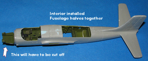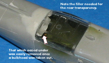 Back at the fuselage, I glued the small window to the interior and then attached the rear upper transparency. Fit on three sides was excellent, but the aft part has a huge step it in. No choice but to use epoxy filler to take care of this and try to get a good blending into the rear fuselage. I made sure that the transparency was well protected with tape during this procedure. I also used some of the epoxy filler on the engine attachments as there were some gaps here as well.