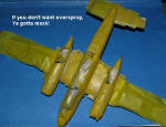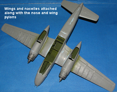After painting the main gear with Alclad II Airframe Aluminum (which is really too bright and will be dulled down later), it was trapped between the engine nacelles. Care needs to be taken during this step to be sure all the mounts stay in place while the nacelles dry. Though I didn't do it, it would be wise to fit these to the wings before the glue dries. I did not and had a gap in one of them when I did fit them in place. The other nacelle fit quite tightly. Both have rather large gaps at the rear wing/nacelle join on the top so more filler was needed there.