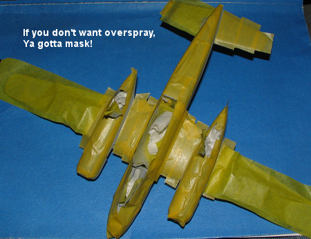 With the wings on, I glued on the engine cowlings, and the cockpit canopy. This section fit a lot better than the back one. I masked it and the rear one (along with the small side fuselage window), in order to prep things for painting. This included filling the wheel wells, cowling fronts, and bomb bay with tape and tissue.