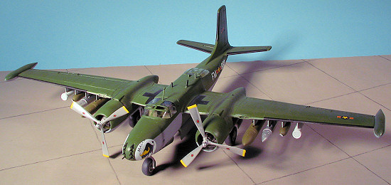 I then added some pastels for the exhaust and probably underdid it as these planes really sooted up the nacelles. This was then sealed with a light coat of clear matte and I sprayed this matte on the wing walk areas as well as the wheels. It was now time for the ordnance. I had only made up 4 bombs for the bomb bays as I figured you'd not see the others. These were carefully glued in and then the bay doors. Next, all the stuff for the pylons was glued in place. Naturally, most of them fell off at least once, but perseverance paid off and they were all eventually stuck on and aligned rather well. At least rather well for me. I took off the masking and added a few of the upper fuselage antennas as shown in the instructions. These were then brush painted the required colors. I managed to knock in the small aft fuselage window so replaced it with a white glue replacement. It actually looks better than the original. The clear tail light was glued on, then I attached the props. The prop shaft is a bit short and you'll end up with the props rubbing the front of the engine cowlings, so one has to be careful to prevent it. I then photographed it before something major fell off!