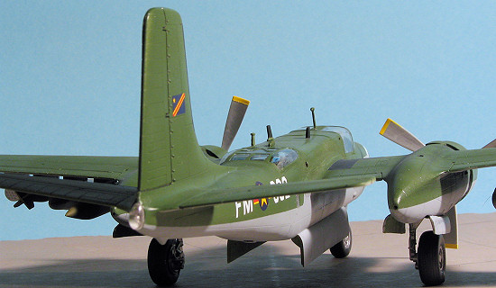 Though it may be that the US versions would be easier to paint, I couldn't pass up on the Congolese options provided in the kit. This calls for the plane to be FS 36375 Light Ghost Grey (a color that did not exist in 1967) on the bottom, and FS 34097 on the upper side. The demarcation line is a hard one so masking is the only way to go. I painted the underside color first, along with as much of the ordnance as I could. I also masked off the prop tips and painted them yellow. The props were painted bare metal, for the photos in the reference show them not to be black. I used Testors Model Master enamels for both of these shades and most other colors as well.