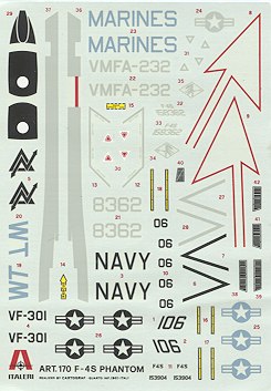 Italeri has always had good instructions and these are no different. A nice parts layout is provided as well as color information in Testors, FS 595 (where applicable) and generic names. The construction drawings are well done with hints and suggestions provided as needed. Markings are provided for two aircraft, and for that you need to look at the back of the box as that info is not included with the instructions. First is the box art aircraft from VF-301 in one of the variations of the Heater-Ferris experimental scheme that this unit used for several years. The other is a VMFA-232 F-4S in A tactical scheme of FS 36231 over FS 36375. The Italeri decals are nicely done and quite matte. They provide both a false canopy for the VF-301 aircraft and upper wing walk areas for the VMFA-232 aircraft.