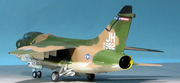 The landing gear were installed after the silly putty masking was removed. The nose gear is very loose and I used super glue to fix it in place. Once the gear were installed, I sprayed a gloss clear on it in preparation for decals. For this build, I used Wolfpak Decals 72-003. It has a number of nice Vietnam era planes, including an A-7D from the 3TFS/388TFW based at Korat in 1975. This unit was involved in the SS Mayaguez operation in mid 1975. The decals have a LOT of clear carrier on them so you may want to trim them before use if you have this sheet. Though it states it will work on the ESCI kit, I ran into a number of issues. This leads me to believe that perhaps the ESCI kit may not have good fidelity to shape or some of the markings are the wrong size. For instance, the HF radio antenna lines on the fin do not match the kit engraved areas, the tail band on the sheet is too short, and the codes/serials seem to be too large as they fit pretty far down the fin. The decals are very thin so one has to be cautious when applying them.