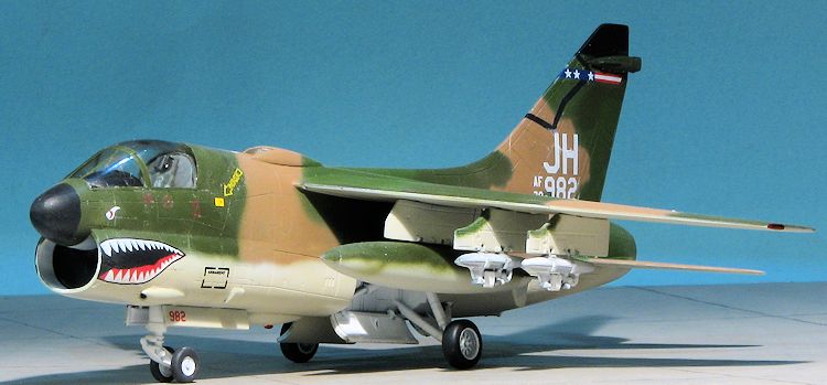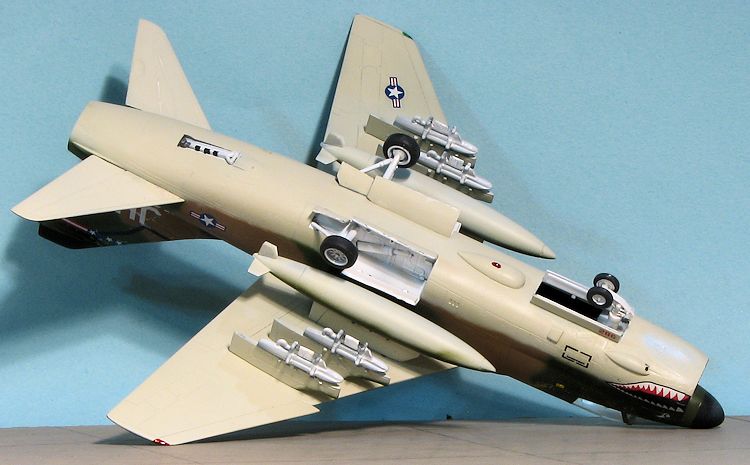 Wings are a full upper surface with an insert for the lower inside. This insert has the two inner pylon areas already drilled out. The outer pylon is a butt join and all pylons are single piece moldings. To model folded wings, the builder will have to do some surgery. To my knowledge, the only 1/72 A-7 that can be built with folded wings is the Matchbox kit. For things under wings you have a pair of drop tanks, a TER and MER with lots of Mk 80 bombs to attach to them. You can also mount either Shrike or Maverick missiles, both of which are appropriate for the USAF version of the Corsair II. I should mention that there are fuselage mounted Sidewinders, but these were frequently not installed so for most cases one shouldn't bother attaching the pylons.
