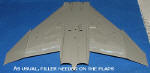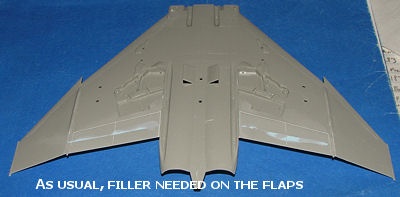 This particular kit had been started in that the previous owner had already glued on the main engine intakes and the small cooling intakes on the nose. He did a good job on it as all I had to do was put on a couple of applications of Mr Surfacer, sand it down, and rescribe the lost detail with my Xacto. First thing I did was to glue the wings together. Hasegawa molds the aft portion of the lower wings with the upper wing halves. Makes for a nice sharp trailing edge, but there is a seam that I've never been able to get right, so out with the filler. Wouldn't be so bad if the seam was along a panel line, but it isn't. The inserts for where the bridle attachments would go were also installed. Fit on these is perfect.