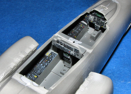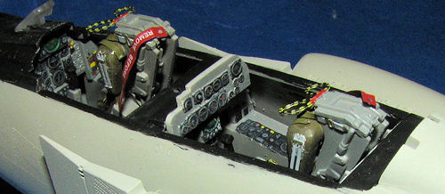 Back at the rest of the kit, I grabbed the Vallejo matte black, thinned it a bit and went after all the instruments on the side consoles and the instrument panels. Then I used some light grey to dry brush all of these bits to bring out some detail. Next, red and yellow, also Vallejo acrylics were used to add some color to things. In reality, aircraft cockpits are very dull with almost no color, yet we paint on these bright bits as if someone had held down the 'lamp test' button! I also used transparent green on the radar scope faces. I imagine that gloss black would have been more appropriate.