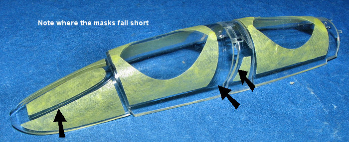 Then I used a brand new Eduard mask set specifically made for the Hasegawa 1/48 F-4. Unfortunately, they don't fully fit. I'm not sure how this screw-up happened, but the center part of the windscreen, the pilot canopy and the smaller windows between the two canopies are too small (see the image). I have heard from others who corroborate that they have also found their Eduard masks to have sections that don't fit the prescribed kit. This is not difficult to fix, but takes as much additional work as having to mask it yourself using tape. Because of the uncertainty that a set may not fit what it says it will, I cannot recommend using these masks and suggest you save your money as you will be taking a chance.