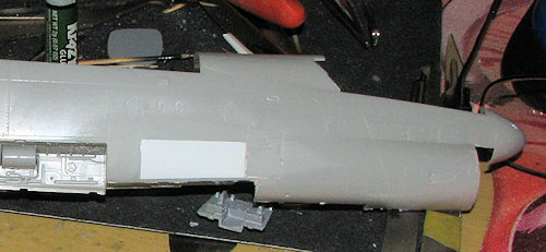 During all this, I went ahead and, after a bit of trimming to remove the hinges, installed the fuselage avionics bay doors closed. I ran into a bit of a problem when I could not find one of them so ended up having to make a new one out of plastic card. I deliberately chose card that was a bit thicker than needed as the door curves slightly on the lower section and this would allow me to sand in that curve. While doing this I also noticed quite a few sink areas on various kit pieces. Guess that when a mold is used as much as this, sink areas and flash are to be expected. I then set about filling in those sink areas.