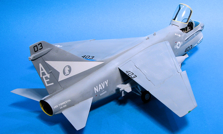 Once all that was done, I removed the Silly Putty masking from the wheel wells and glued in the landing gear. I didn't find out until later that I'd glued in the nose gear a bit crooked so pay attention. To be honest, I did not find any of the gear easy to install. I then attached the resin wheels. For this I used Royal Resin's set R028. Once those were affixed, the airframe got a gloss coat in preparation for decals. I had wanted to do a scheme from AirDoc 48014 which was all Pacific Fleet units. but when it got time to apply them, I couldn't find the instructions. I searched for several days and even put a plea on the web site's forum, but to no avail. Fortunately, I had set 48013 for Atlantic Fleet units and after about three or four weeks, used those decals. I picked a nice scheme from VA-105. After I put on the very last decal, I found the original instructions!