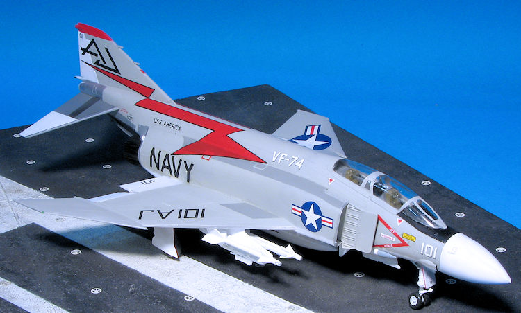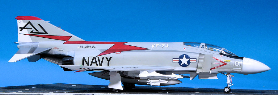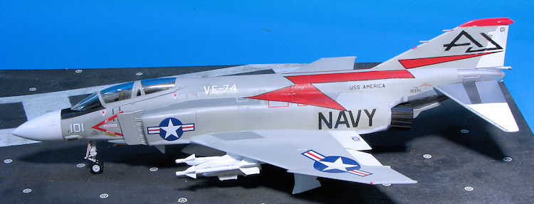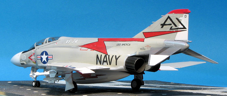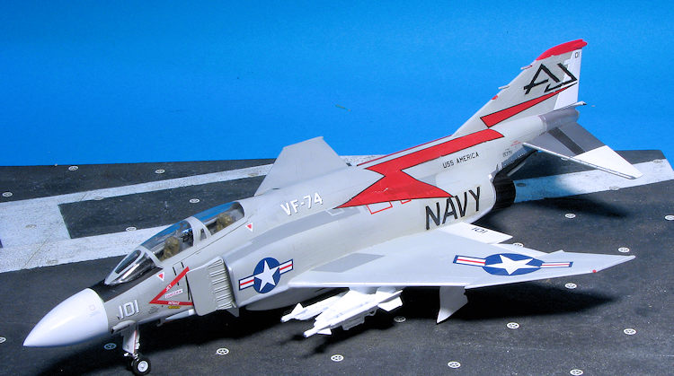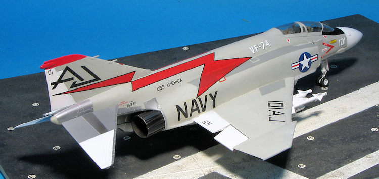 Painting the F-4 is a rather complex situation, even for one that is light gull and grey. It has to do with all the metallic parts on the rear fuselage and stabilizer. What I did for the stabs was paint it white, then masked it and did the metal parts using shades of Alclad II. For the rear fuselage, I first painted the metal parts, then masked those and applied the other colors. I used Superscale sheet 72-823 which had a nice VF-74 plane on it. This plane has a white radome. I found that using 1mm tape for the initial demarcation line works well. The rest can then be filled in with wider tape. The fin tip on this needs to be painted red and the black nose anti-glare panel needs to be painted as well. As a note, the speedbrake interior is red, but the well is not. A lot of F-4 modelers will paint the speedbrake well red, but period photos show this was not generally the case.