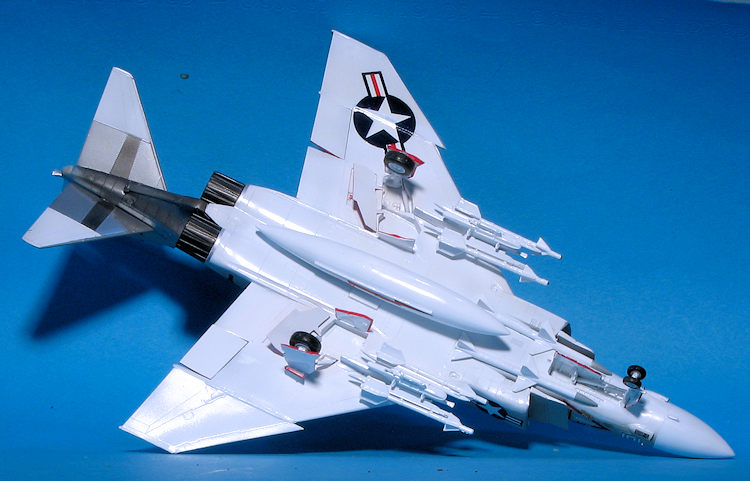 Well, this one was quite a trial. I do hope that I managed to roll a year's worth of disasters into this one. Some issues with the standard kit are the space between the tailplanes and fuselage, the angle of the main landing gear doors (they should be even with the ground), the 'thingies' on the Sidewinders, and the molded in TERs. The final result somewhat belies all the issues I had, most of them self-induced and not a fault of the folks at Monogram who designed it. It is a 30 year old kit that is based on the 1/48 scale kit that is probably ten years older still. Despite all that, it can be made into a nice model and is worth picking up if you see one on a vendor's table. Just be sure to parts check it!