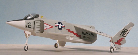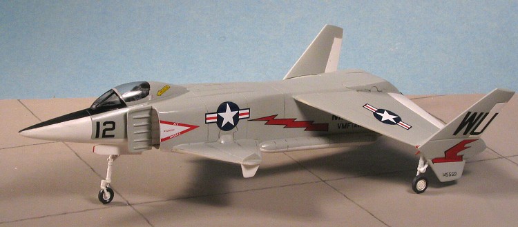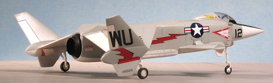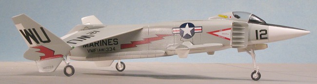 At this stage, I started rummaging around for a set of markings. The Anigrand ones are a known quality in that they are well printed, a bit thick and don't like a lot of curve. They are also not amenable to setting solutions. I found a nice Microscale sheet for F-8 Crusaders (72-086) that looked as if it would fill the bill. The price printed on the sheet was $1.50 so this sheet has to be 30 years old if it is a day. I was a bit worried that it would fall apart so tried one marking that I wasn't going to use. It worked just fine. A bit fragile, but it wasn't yellowed so I started cutting out the unique markings for the VMF-334 F-8C to transpose to my XFV-12. I used all the unique markings as they actually fit pretty well. A bit of the Microscale (now Superscale) decal system was more than enough to get them to cooperate. I also used some nearly as old (only 20 years) insignia from a Microscale sheet I bought in 1982 (priced at $3.00). Again, no problem with yellowing or being overly fragile. The clear carrier wasn't trimmed as my experience with older decals showed that if I did that, it would cause the edges to chip. The model was given a coat of matte clear to seal in the decals once they had dried and the kit was washed. I chose mattes vice gloss for a reason you'll see a bit later.