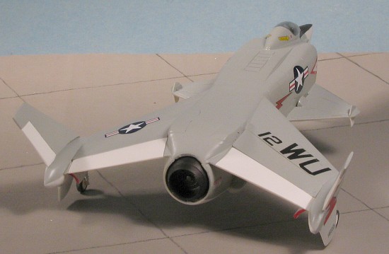 I then masked the heck out of the underside of the kit in preparation for the upper side color. I used a hard demarcation line as it would not be out of character for the time period. Especially on factory fresh aircraft. The ratty look was more prevalent after multiple sailor-applied camouflage (as in a rattle can on the flight deck). Then the upper surface was painted with Gloss Light Gull Grey using Testors Model Master enamels. When dry, an anti-glare panel was done in black all the way out to the tip of the nose in a manner similar to the F-104. The exhaust was painted using Alclad II Jet Exhaust on the inside and Testors Metallizer Burnt Iron on the outside and set aside until after decaling.