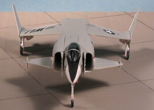 ghly recommend getting a trashed Skyhawk kit and robbing landing gear and wheels from it for this kit as it really would benefit from them. I then painted the edges of the gear doors red and glued them in place. Nose gear door fit very well, with the main gear doors just being butt joins. I chose not to install the kit supplied Sparrows as all the fins had air bubbles in them and I couldn't find a suitable set of plastic ones. Not really a problem as planes spend the vast majority of their time unarmed. The kit was then given a misting of clear gloss (Future) to add a bit of sheen to things. Even the most weathered USN planes of the period were not totally flat and besides, flats are MUCH easier to photograph (no glare problems). The misting of gloss gave me a nice semi-gloss that is much more pleasing to the eye. I pulled the masking from the clear bits and, after being amazed at no fogging from the super glue, hurried off to photograph it before something broke.