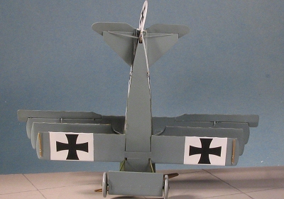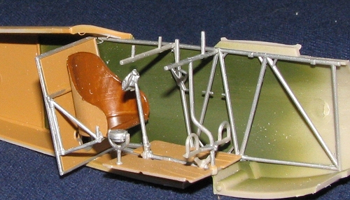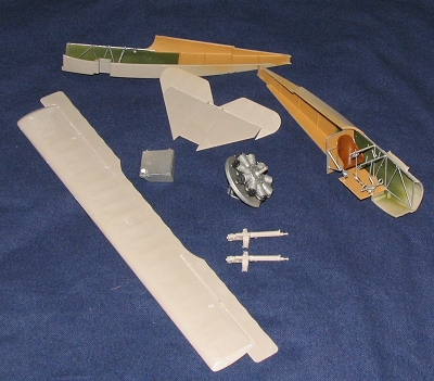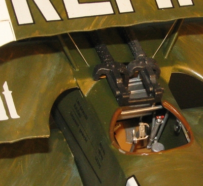 ed. The guns were then fully assembled and painted, then glued in place. The various feed and waste chutes are supposed to fit into or over the appropriate bins so care needs to be taken when fixing these in place. The upper wing was then glued on, taking care to get the cabane struts properly affixed. Then the little wing tip skids were glued on after being painted wood. I also painted the prop in this color and tried to paint on some large grain, but it looks hokey. Not something I'm good at.