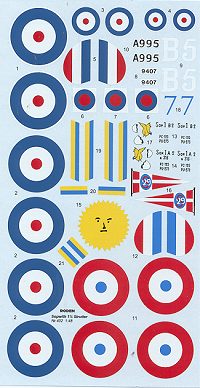 Colors are given as both generic colors and as Humbrol paint numbers. The decal sheet for this kit is very colorful and provides for two British and two French planes. The French aircraft are the ones with all the color! The two Brit planes are the box top aircraft from 3 Wing RNAS and flown by ace Robert Coltishaw. The other British aircraft is from 70 Sq RFC. These planes are painted matte green upper and 'linen' lower surfaces. The two French planes are quite distinctive and are overall linen in color. The first is from Esc 29 and the other from Esc 227 in 1917. The decals are super and very well printed. They should pose no problems with application other than being very thin.