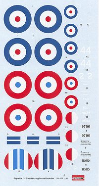 Markings are given for four aircraft. Unlike the previous two seat version, these are not as colorful and all aircraft are dark green upper and linen undersides with bare metal engine sections. The first one is a French bird with a red/white segmented circle for some additional color. No unit is given. Next is a 3 Wing RNAS aircraft with a simple aircraft number. This is the box art plane. From 2 wing RNAS is an even more bare Strutter. Finally, yet another 3 Wing RNAS (remember, most of these planes went to the RNAS) aircraft with a blue and white band around the fuselage. Again, the decals are superbly printed, quite thin and should go on well.